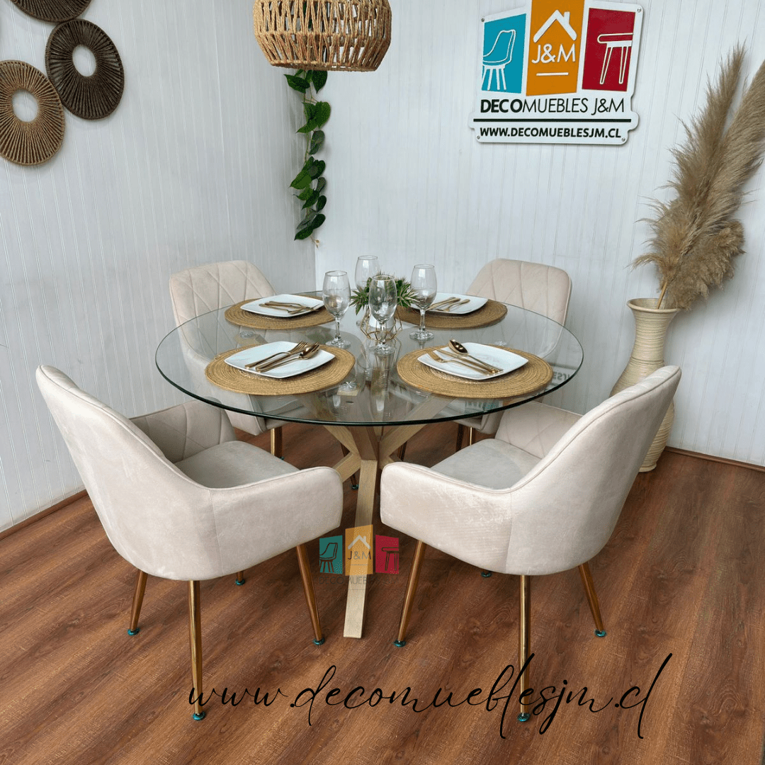 agosto 18, 2025Comedor mesa redonda de 120cm de diámetro, vidrio templado de 9mm de espesor bastante resistente con patas de fierro color madera, antideslizantes para regular la estabilidad. Combinado con 4 sitiales diamante tapizados en tela velvet, suave y con diseño de costura, apoya brazos y patas en metal color dorado. Modelo elegante y de alta calidad.