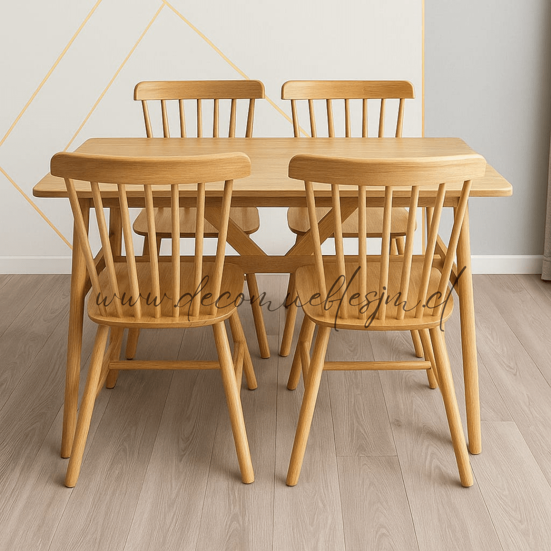 septiembre 29, 2025Mesa rectangular, Mesa de comedor moderna y Multifuncional con estructura resistente de fierro color madera, cubierta de MDF viene con 4 sillas Windsor de madera natural. Resalta tus espacios con estilo moderno.